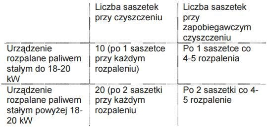 Należy wsypać 1 lub 2 saszetki (patrz tabelka w galerii) do urządzenia grzewczego przed rozpaleniem go. Na początku zaleca się używać środka za każdym razem, gdy rozpalasz ogień. Po dziesiątym razie należy używać środka co 4-5 rozpalenie urządzenia.