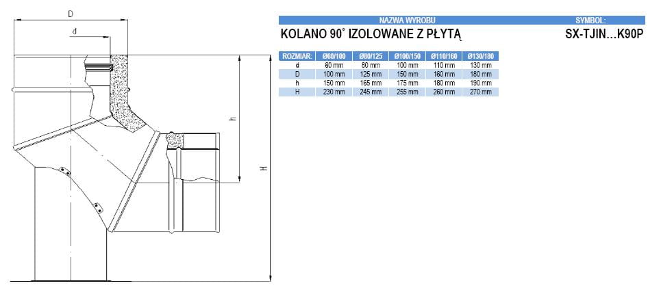 Kolano TURBO 90 stopni z płytą kotwową izolowane nierdzewne 60/100