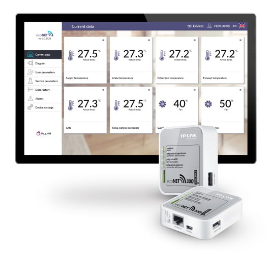 Rekuperator VENT CLEAR zapewnia możliwość zdalnego sterowania za pomocą aplikacji ecoNET na smartphone lub witryny internetowej www.econet24.pl. Do uruchomienia tej funkcji wymagany jest panel sterujący Basic lub VC Touch 4 oraz dodatkowy moduł internetowy VENT CLEAR ecoNET.