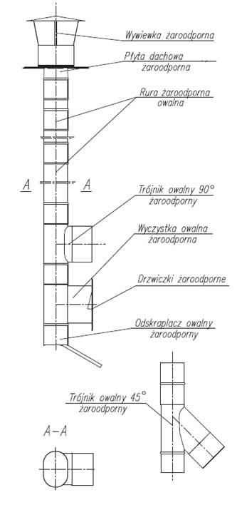 Mocujemy linę do rury o długości 1m, wpuszczamy ją do szybu do momentu wystawania jedynie kielicha, zakładamy kolejną rurę, zwracając uwagę na całkowite wsunięcie jednej rury w kielich drugiej i znowu opuszczamy, aż do momentu wystawania kielicha. Czynności te powtarzamy, aż w wykutym otworze pojawi się końcówka pierwszej rury. Instalujemy trójnik, wyczystkę i odskraplacz, a następnie łączymy je z rurami. Ostatnią rurę wystającą z komina przycinamy na długość taką, aby można było za montować w kielichu ostatniej rury płytę dachową i przykręcić ją do korony komina. W płycie dachowej montujemy wywiewkę. Usytuowanie trójnika uzależnione jest od sposobu poprowadzenia czopucha z kotła. (Przy czopuchach o przekrojach innych niż okrągły, wykonujemy także trójniki lub redukcje na specjalne zamówienie klienta). Drzwiczki wyczystki powinny być tak ustawione, aby była możliwość swobodnego dostępu do wyczystki. Ponadto w odnodze wyczystki, za drzwiczkami, powinna znajdować się przegroda ogniowa, uniemożliwiająca wypadanie żaru bezpośrednio po otworzeniu drzwiczek (u nas drzwiczki żaroodporne oferowane są w komplecie z przegrodą ogniową). Skropliny powinny być odprowadzane do neutralizatora skroplin, szczelnego pojemnika lub bezpośrednio do kanalizacji (o ile dopuszczają takie rozwiązanie przepisy prawne).