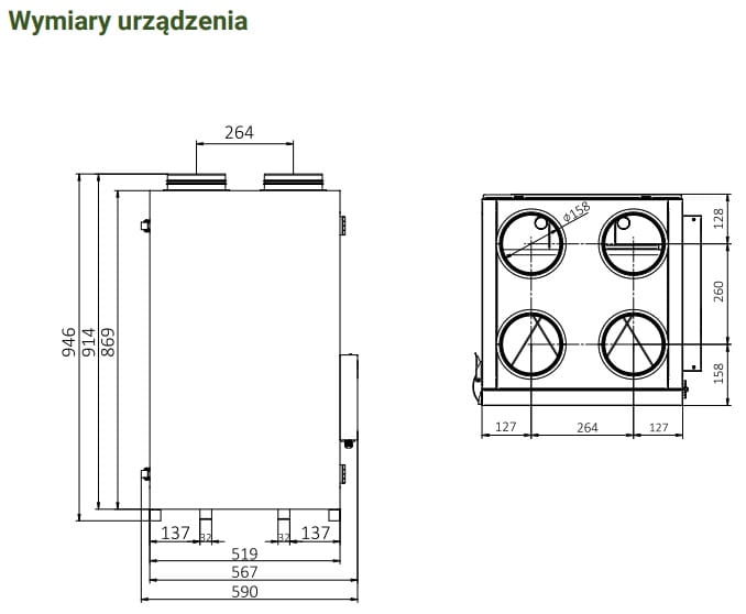 2. Uniwersalne urządzenie - Użyte rozwiązania umożliwiają modyfikację urządzenia i zmianę funkcji poszczególnych przyłączy wentylacyjnych tj. wywiewu i nawiewu umieszczonych z lewej na prawą stronę rekuperatora.
