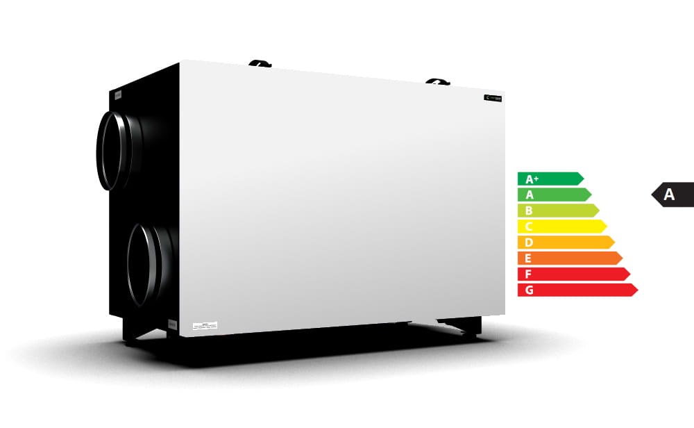 Wysoki odzysk ciepła - Przeciwprądowy wymiennik ciepła z funkcją wysoka sprawność - Wymiennik HE (High Efficiency) został skonstruowany, tak aby uzyskać jak najwyższy stopień odzysku ciepła z powietrza wywiewanego i przekazanie go powietrzu nawiewanemu. Sprawność w urządzeniu z zamontowanym wymiennikiem HE sięga 82%, natomiast w przypadku mniejszych wydajności sprawność może osiągnąć wartość aż 96%.
