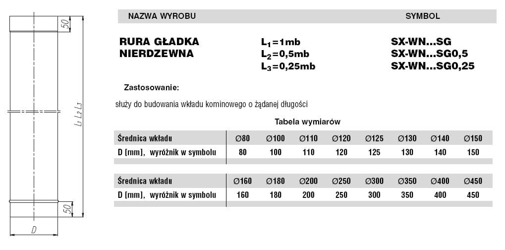 Gładki wkład kominowy wykonywany jest z blachy o grubości 0,5 ÷ 0,6 mm, w zależności od średnicy. Wszystkie części rurowe łączone są liniowo technologią spawania plazmowego. Poszczególne elementy montowane są ze sobą kielichowo. Zakres średnic od 80 mm do 450 mm.