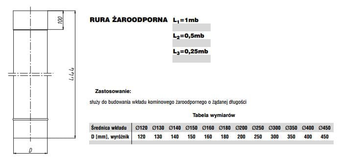 Wszystkie elementy proponowanych wkładów żaroodpornych wykonane są z blachy o grubości 1,0mm. Kielichowe połączenia poszczególnych elementów o długości 100mm, zapewniają szczelność oraz kompensację wydłużeń liniowych wkładu wynikających z możliwości wystąpienia bardzo wysokich temperatur. Oferowane są w zakresie średnic 120mm do 450mm.