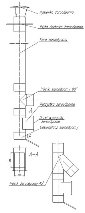 Mocujemy linę do rury o długości 1m, wpuszczamy ją do szybu do momentu wystawania jedynie kielicha, zakładamy kolejną rurę, zwracając uwagę na całkowite wsunięcie jednej rury w kielich drugiej i znowu opuszczamy, aż do momentu wystawania kielicha. Czynności te powtarzamy, aż w wykutym otworze pojawi się końcówka pierwszej rury. Instalujemy trójnik, wyczystkę i odskraplacz, a następnie łączymy je z rurami. Ostatnią rurę wystającą z komina przycinamy na długość taką, aby można było za montować w kielichu ostatniej rury płytę dachową i przykręcić ją do korony komina. W płycie dachowej montujemy wywiewkę. Usytuowanie trójnika uzależnione jest od sposobu poprowadzenia czopucha z kotła. (Przy czopuchach o przekrojach innych niż okrągły, wykonujemy także trójniki lub redukcje na specjalne zamówienie klienta). Drzwiczki wyczystki powinny być tak ustawione, aby była możliwość swobodnego dostępu do wyczystki. Ponadto w odnodze wyczystki, za drzwiczkami, powinna znajdować się przegroda ogniowa, uniemożliwiająca wypadanie żaru bezpośrednio po otworzeniu drzwiczek (u nas drzwiczki żaroodporne oferowane są w komplecie z przegrodą ogniową). Skropliny powinny być odprowadzane do neutralizatora skroplin, szczelnego pojemnika lub bezpośrednio do kanalizacji (o ile dopuszczają takie rozwiązanie przepisy prawne).