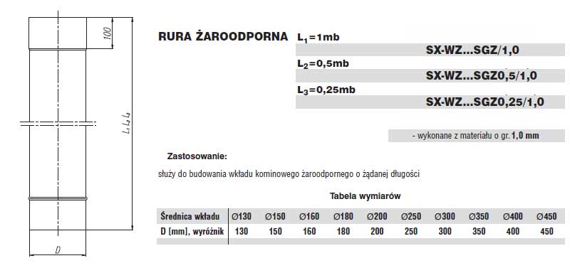 Wszystkie elementy proponowanych wkładów żaroodpornych wykonane są z blachy o grubości 1,0mm. Kielichowe połączenia poszczególnych elementów o długości 100mm, zapewniają szczelność oraz kompensację wydłużeń liniowych wkładu wynikających z możliwości wystąpienia bardzo wysokich temperatur. Oferowane są w zakresie średnic 130mm do 450mm.