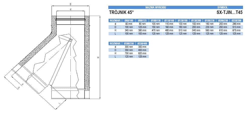 Trójnik 45 stopni TURBO izolowany nierdzewny 80/125