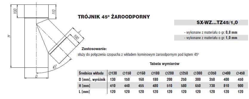 Służy do połączenia czopucha z wkładem kominowym żaroodpornym pod kątem 45o.